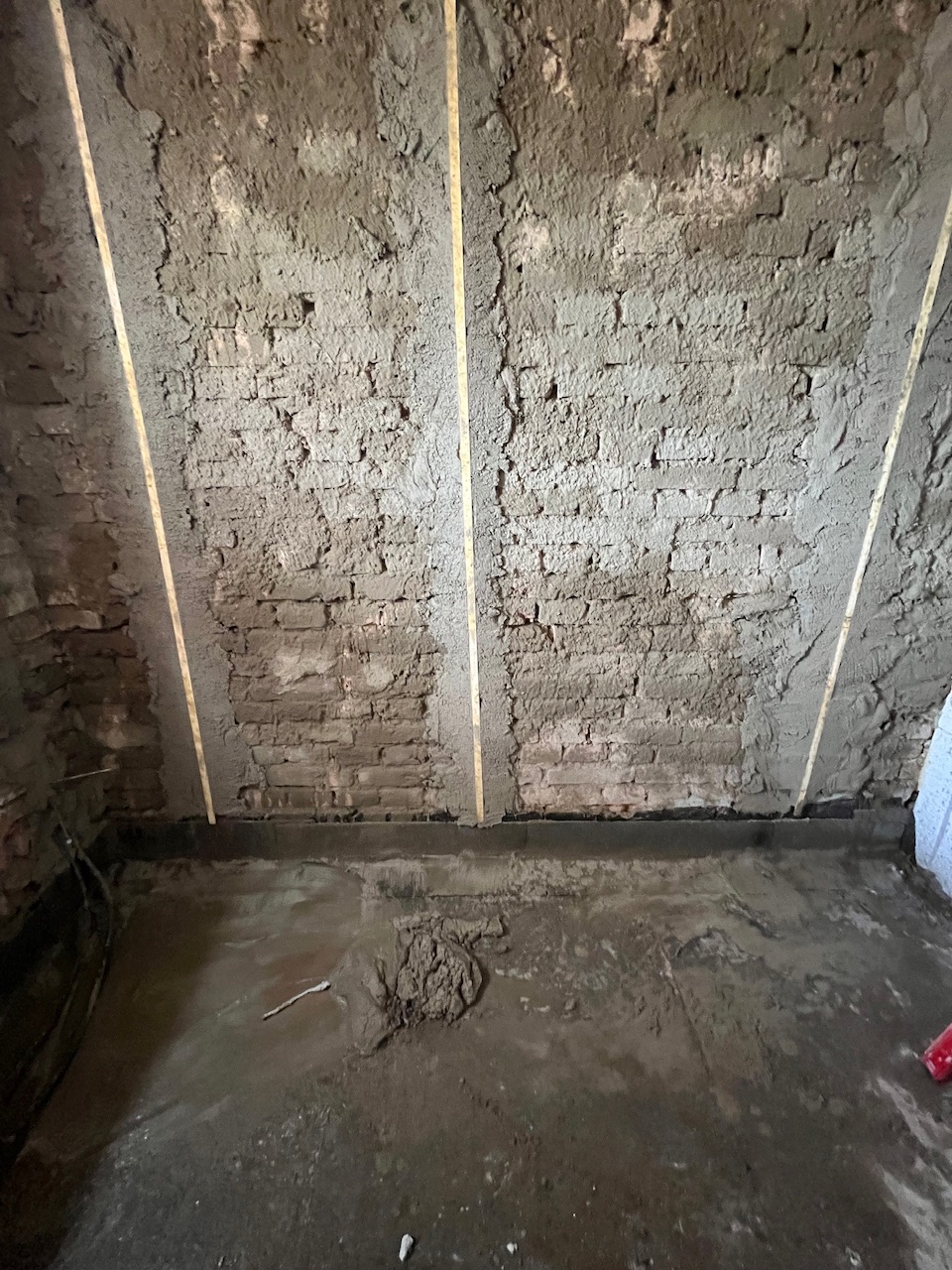Úprava asfaltových pásů: Pokud vytažené asfaltové pásy (límce) nejsou k cihelnému zdivu pevně přitaveny (což se z fotek tak jeví), seřízněte je přímo ve vnitřním rohu mezi zdí a podlahou. Volně visící pás by totiž bránil dokonalému a těsnému spojení nové hydroizolační bitumenové stěrky se zdivem a podlahou.
