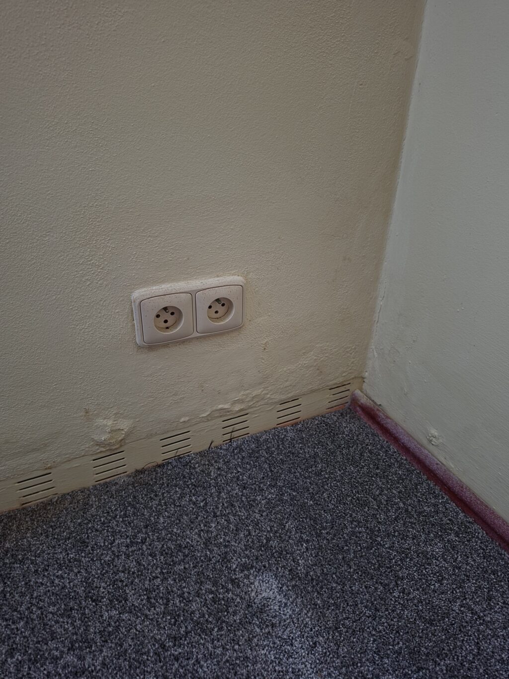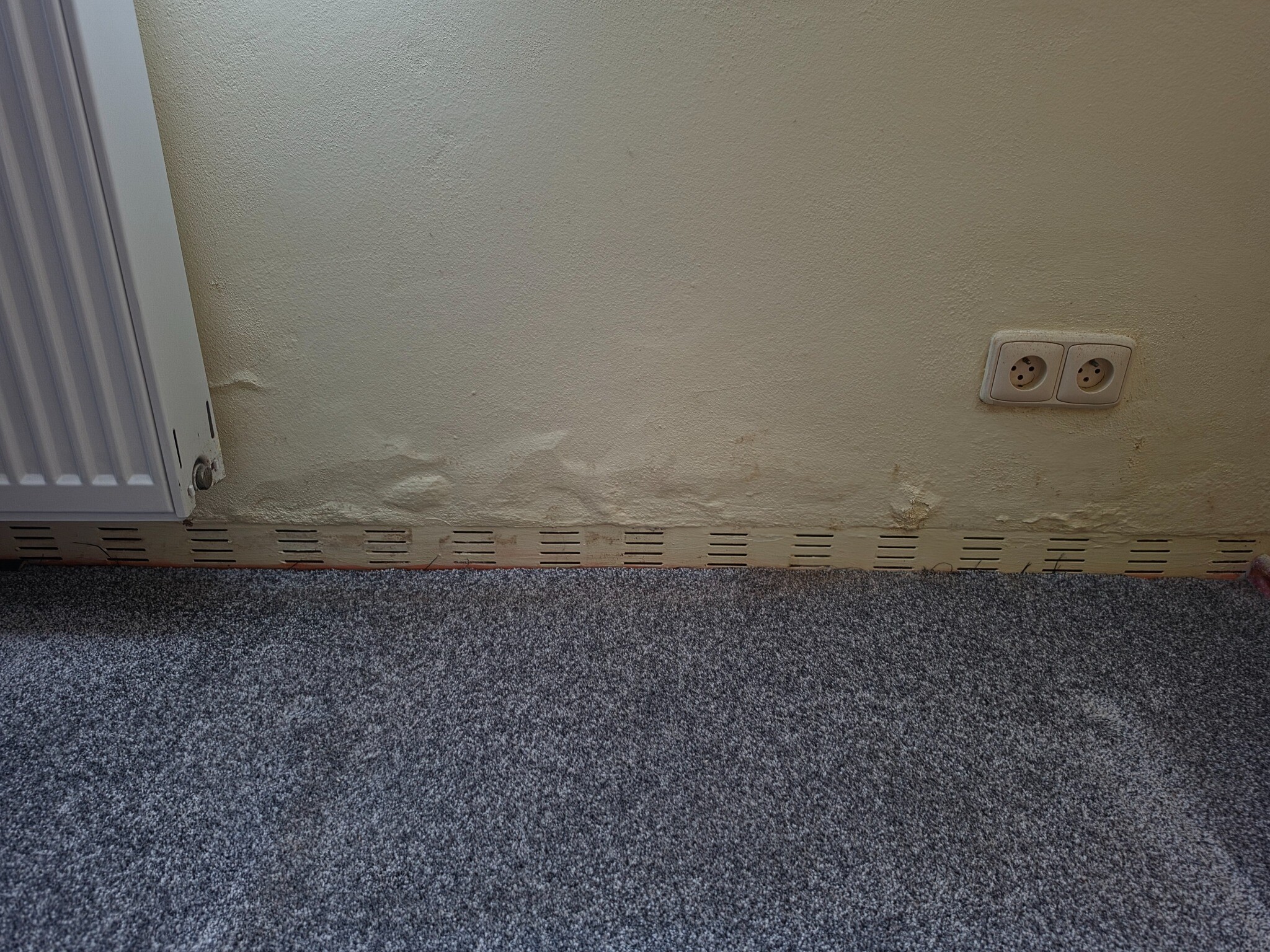 5. Sanace omítek a odvětrávací lišty Na fotografii je vidět odvětrávací lišta, která zjevně příčinu nevyřešila. Tyto lišty se často používají jako pokus o odvětrání vlhkosti, ale bez odstranění zdroje vzlínání jsou neúčinné.